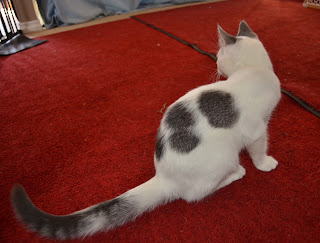 Well, it's happened again. Yesterday Mom came home from work with a new foster. A kitten this time! When will the madness stop? Diesel went back to his foster Mom last night so it is a lot more quiet.